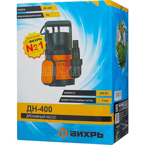 Мощность: 400 Вт. Высота подъема: 8 метров. Производительность: 11,3 м3/ч. Применение: чистая вода. Поплавковый выключатель: внешний. Диаметр пропускаемых частиц: 5 мм. Диаметр выходного отверстия: 1,5 дюйма. Защита от сухого хода: нет. Материал корпуса: пластик. Напряжение: 220 В. Частота: 50 Гц. Тип электродвигателя: асинхронный с короткозамкнутым ротором. Максимальное количество включений в час: 20. Температура воды: 0…+35 °С.