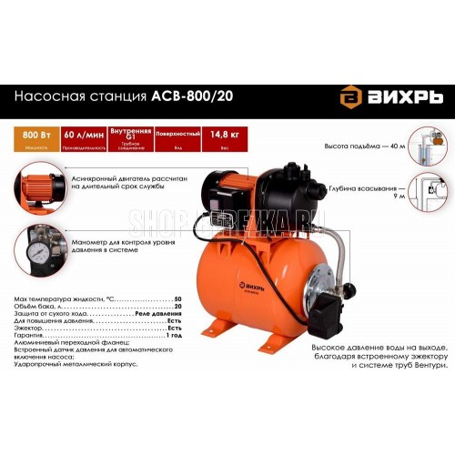 Напряжение питающей сети, В 220-230. Частота питающей сети, ГЦ 50. Мощность, Вт 800. Тип насоса Центробежный. Максимальная высота подъема воды, м 40. Максимальная производительность, л/мин 60. Диаметр входного и выходного отверстий, дюйм 1. Максимальная глубина всасывания, м 9. Материал корпуса насоса Пластик. Емкость гидроаккумулятора, л 20. Допустимая концентрация твердых частиц в перекачиваемой воде, г/м3-150. Гарантия 1 год. Габариты упаковки 0.45х 0.505х0.28 м. Вес, кг 11.4 кг.