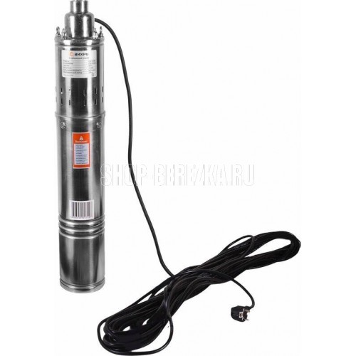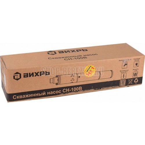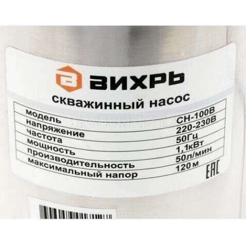 Скважинный насос ВИХРЬ СН-100B. Мощность, Вт – 1100; Диаметр насоса, мм – 102; Максимальная высота подъема, м - 100; Максимальная подача, л/мин – 50; Выходное отверстие, дюйм – 1;