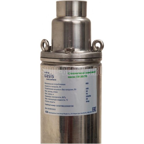 Мощность, Вт 370. Макс. расход, л/мин 30. Макс. напор, м 70. Макс. глубина погружения, м 50. Макс. допускаемая концентрация твердых частиц в воде, г/м3 300. Макс. размер пропускаемых частиц, мм 0,5. Материал корпуса Нержавеющая сталь. Тип двигателя Маслозаполненный двигатель. Длина кабеля 30. Диаметр изделия, мм 75.