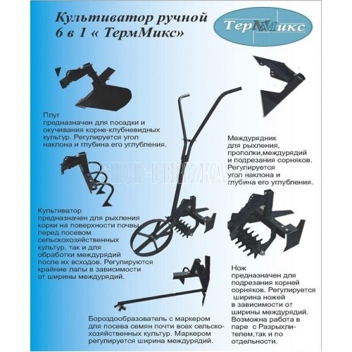 ТЕРММИКС Культиватор ручной 6 в 1 "ТермМикс" Культиватор пропашной Терммикс: параметры и характеристики Агрегат для обработки земли обладает килевидным типом сошника и диаметром колеса в 32 см. По габаритам культиватор 64х30х30см, а по весу – чуть меньше 8 кг. В комплектацию механического культиватора комбайна входят: - несущая рама; - колесо и его ось; - перемычка и нож «бритва»; - маркер вместе с соответствующим держателем; - лапы и регулировочный диск.