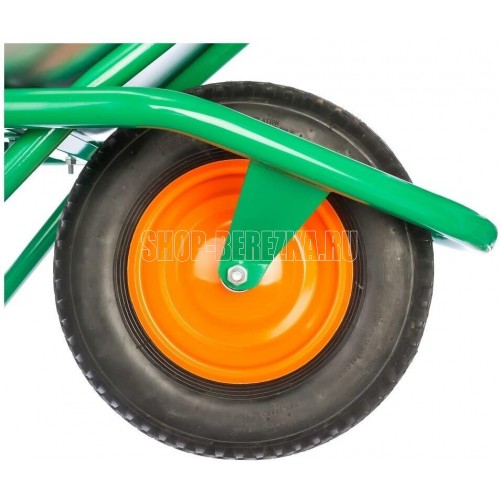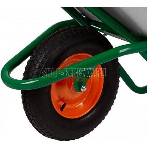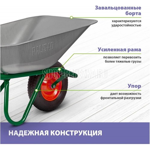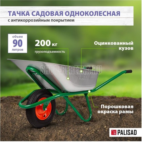Усиленная садово-строительная тачка Palisad 689183 с кузовом объемом 90 л и грузоподъемностью 200 кг позволяет транспортировать строительные материалы, удобрения, урожай и другие грузы. Рассчитана на интенсивную эксплуатацию, подходит для выполнения большого объема работ. Тачка используется в строительстве и сельском хозяйстве.ПреимуществаУвеличенная прочность — рама выполнена из стальных труб диаметром 32 мм и толщиной 1,2 мм, а кузов — из стали толщиной 0,7 мм.Надежность — завальцованные борта обеспечивают ударостойкость верхнего края кузова.Защита от коррозии — кузов оцинкован, а на раму, опору и диск колеса нанесено порошковое покрытие.Маневренность и хорошая проходимость — тачку с одним пневматическим колесом на 2-х шариковых подшипниках удобно перемещать и разворачивать.Высокая грузоподъемность — благодаря дополнительной опоре кузов выдерживает до 200 кг.Удобная фронтальная разгрузка — в конструкции тачки предусмотрен передний упор.