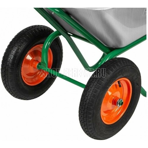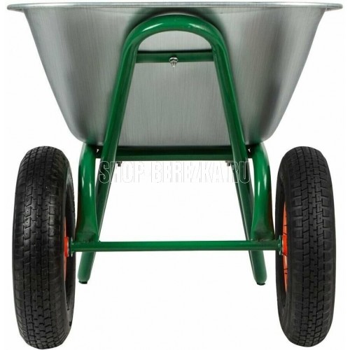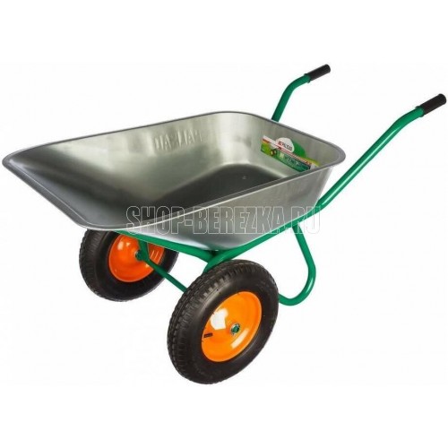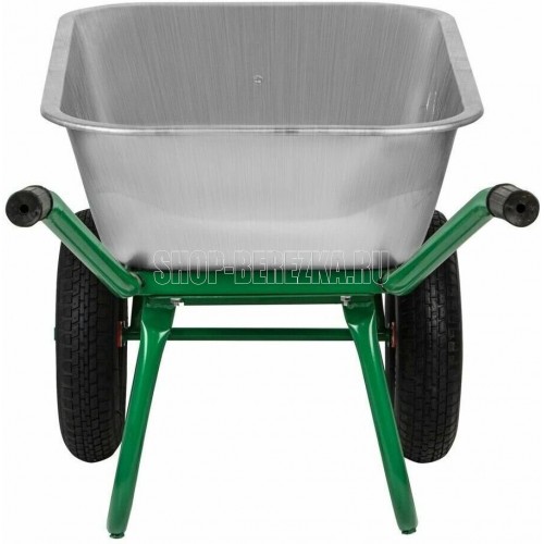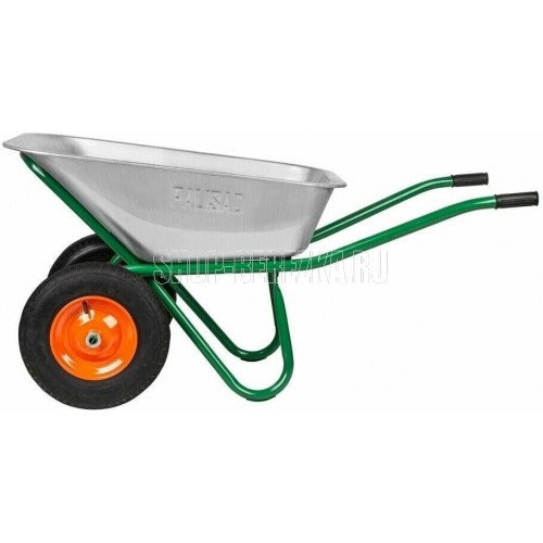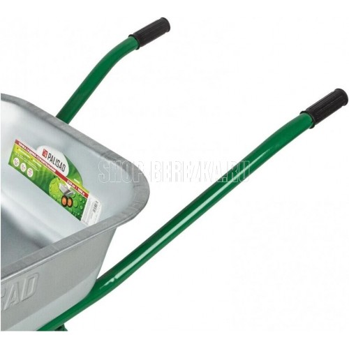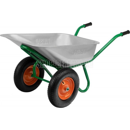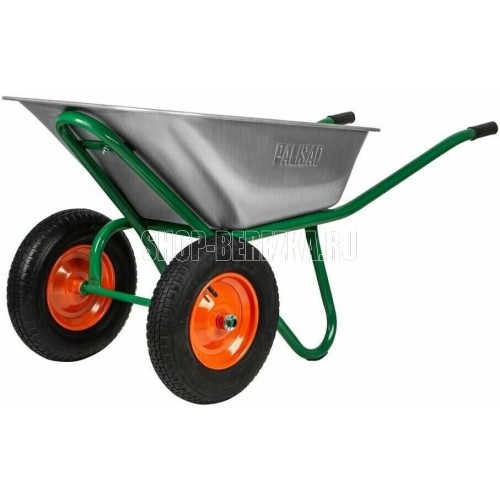 Усиленная садово-строительная тачка Palisad 689233, 2-х колесная, с объемом кузова 100 л, позволяет легко перемещать удобрения, инвентарь, сыпучие смеси и прочие грузы общим весом не более 320 кг. Благодаря ей не придется транспортировать грузы на руках и перегружать спину, поэтому она станет незаменимым помощником для строителей и садоводов.ПреимуществаКоррозионная стойкость — рама, ножки, опоры и диски колес покрыты порошковой эмалью, а кузов оцинкован.Надежная конструкция — толщина стенок кузова составляет 0,7 мм, а рамы — 1,2 мм.Возможность фронтальной разгрузки — тачка дополнена передним упором.Завальцованные борта — верхняя часть кузова устойчива к деформации и механическим ударам, например, при погрузке тяжелых материалов.Маневренность и невысокое давление на грунт — два пневмоколеса на шариковых подшипниках улучшают балансировку и устойчивость тачки.