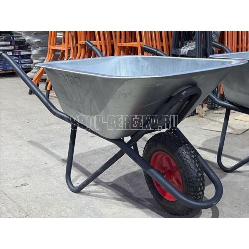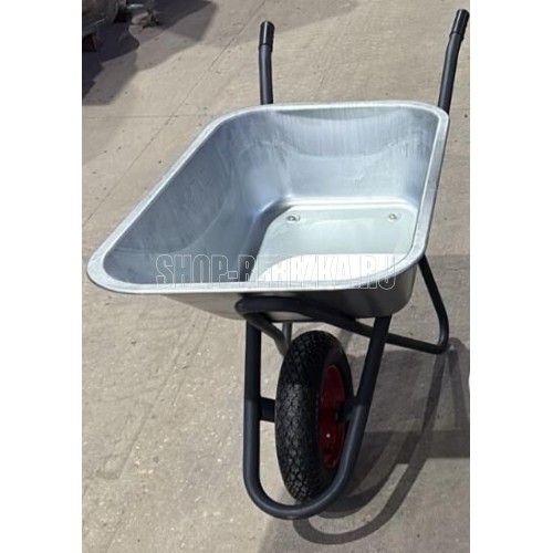 "Материал рамы: сталь Диаметр рамы: O32х1.2мм Материал подрамника: сталь Диаметр подрамника: O25х1.2мм Материал кузова: оцинкованная сталь S - 0,7 мм Объем кузова: 110 л., квадратное Количество колес: 1 шт. Размер колеса: O4.00"" Диаметр втулки колеса: 12мм". Грузоподъемность: 200кг.
