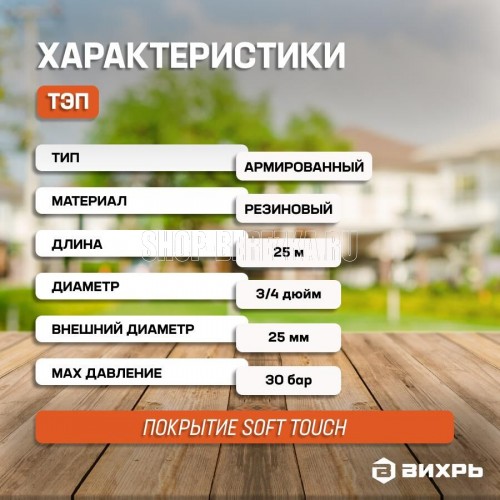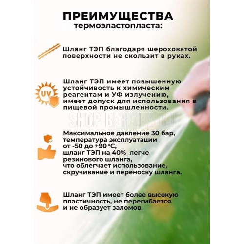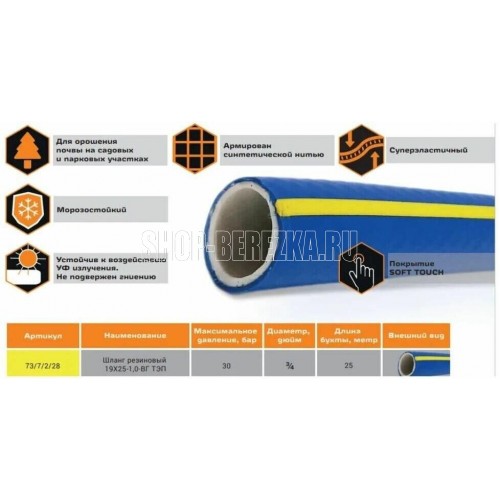 Шланг резиновый с нитяным каркасом состоит из внутреннего резинового слоя, нитяного каркаса и наружного резинового слоя. Применяется для подачи холодной и горячей воды. Диаметр шланга, дюйм - 3/4. Максимальное давление, бар - 30. Морозостойкий. Длина, м 25 .
