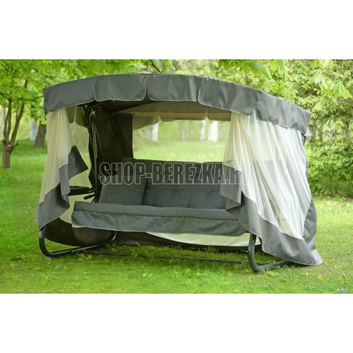 Габаритные размеры изделия (длина х ширина х высота), мм: 2665х1440х1860.Максимальная нагрузка, кг: 320. Каркас: труба стальная O60х1,5мм, полимерное покрытие, полка - 2 шт. Основание сиденья - сетка металлическая. Мягкий элемент: ткань 100% полиэстер (рогожка), плотность 220-230г/м2, наполнитель мягкого элемента поролон листовой 80 мм + синтепон (обшая толщина 100мм), 2 подушки. Декор сиденья и спинки "тафтинг". Тент: кондер с в/о пропиткой плотность 280г/м2, с противомоскитной сеткой (полотно гардинное основовязаное 100% п/э плотность 39г/м2) Регулировка спинки: рычаг трансформации с возможностью фиксации в горизонтальном положении.