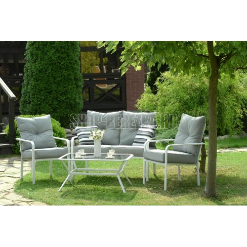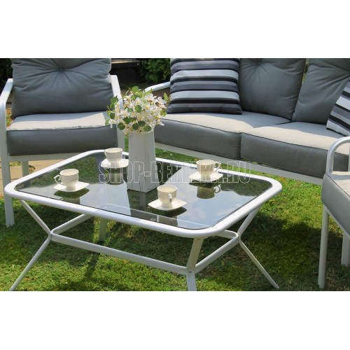 Габаритные размеры изделия (Длина х ширина х высота): -стол: 970x660x435 мм; - кресло: 660x640x880 мм; - диван: 1210x640x880 мм; Мягкий элемент: ткань PANAMA 60% хлопок, 40% п/э, наполнитель эйрофом+синтепон толщиной 120 мм, кант белый, подушки 2 шт. наполнитель синтепон, чехлы сиденья сьемные на молнии - наполнитель спанбонд.