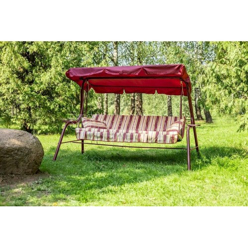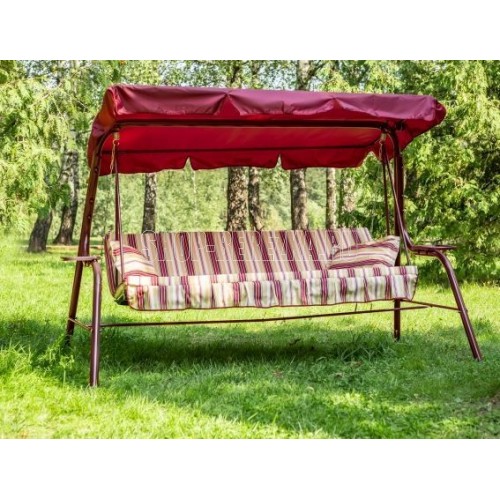 Габаритные размеры изделия (ДхШхВ) 2310х1260х1478 мм, размеры сиденья,спинки и тента (ДхШ) сиденья: 1706х497 мм, спинки: 1706х497 мм, тента: 1840х1020 мм, Каркас: труба стальная Ф 45х1,4мм; полимерное покрытие, Мягкий элемент: ткань 45% п/э – 55% хлопок, плотность 108-111 г/м2 , наполнитель мягкого элемента (листовой поролон 50мм), наполнитель подушек (крошка поролона). Подушки – 2шт. Тент: ткань с водоотталкивающей отделкой 100% п/э плотность 120 г/м2, Регулировка спинки: осуществляется звеньями цепи на требуемый угол наклона. Размеры упаковки: 526х186х1966 мм, Максимальная нагрузка 210 кг, Вес изделия: 34,6 кг.