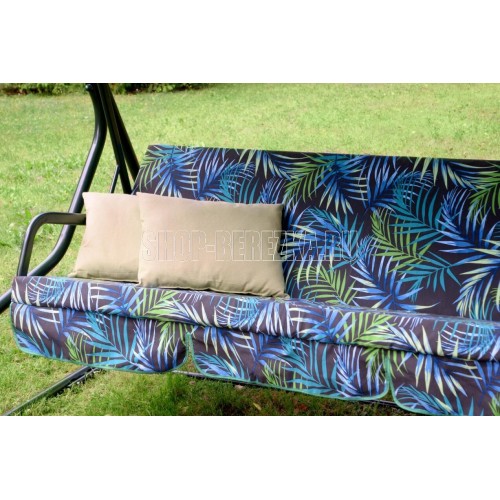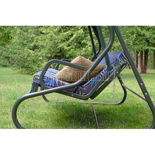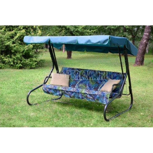 Габаритные размеры изделия (длина х ширина х высота), мм: 2072х1380х1664; размеры сиденья: 1782х532; размеры спинки: 1782х532; размеры тента: 2100x1455. Максимальная нагрузка, кг: 250, Каркас: труба стальная O45х1,4мм; полимерное покрытие; Мягкий элемент: ткань 40% п/э – 60% хлопок, плотность 220-230г/м2, наполнитель мягкого элемента поролон (толщиной 80 мм), наполнитель подушек – крошка поролона. Подушки - 2шт. Тент: Тент ткань с водоотталкивающей отделкой 100 п/э плотностью 125-130г/м2. Регулировка спинки: осуществляется звеньями цепи на требуемый угол наклона, с возможностью фиксации в горизонтальном положении.