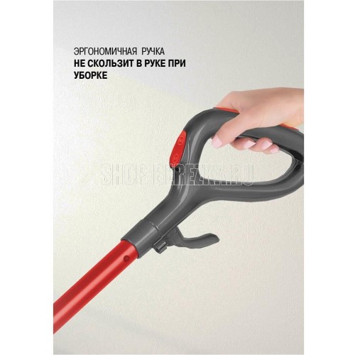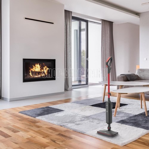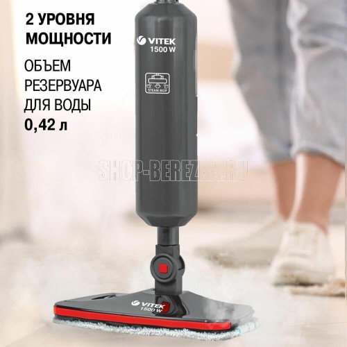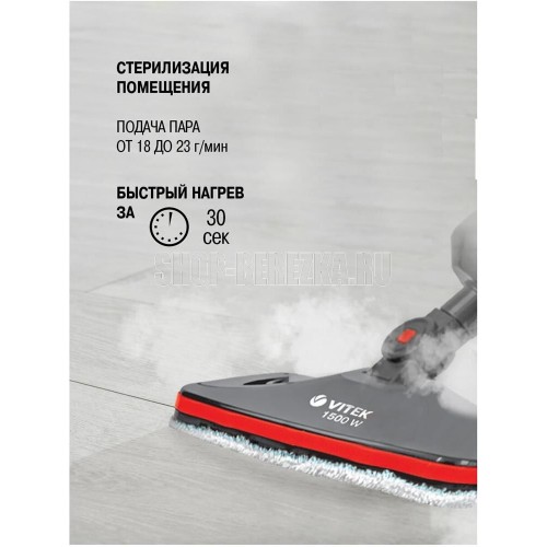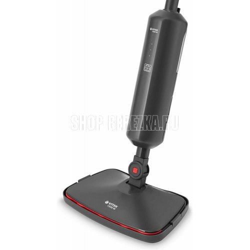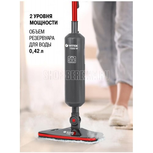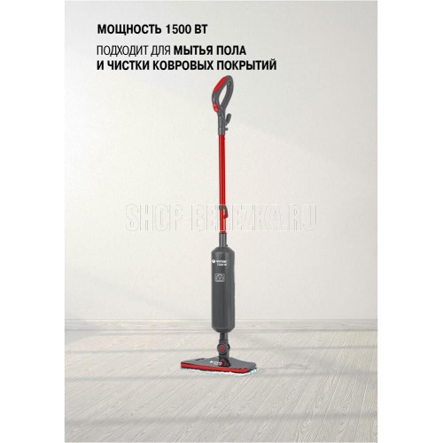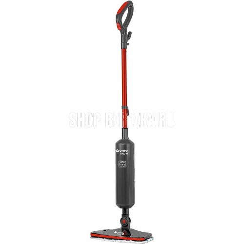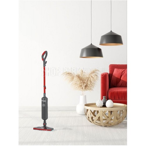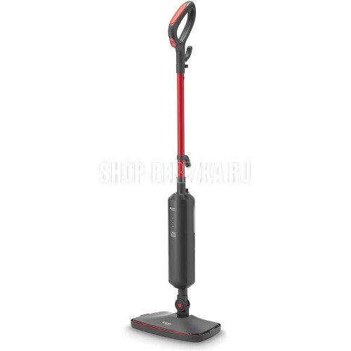 Паровая швабра. Максимальная мощность: 1500 Вт, Время разогрева: 25-30 секунд, Объем резервуара для воды: 0,42 литра, Подача пара: 18-23 г/минут, Съемная ручка, Фильтр для воды, Длина сетевого шнура:4 метра, Номинальная мощность: 1300 Вт, Уровни мощности: 2, Цвет: Графит/красный