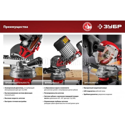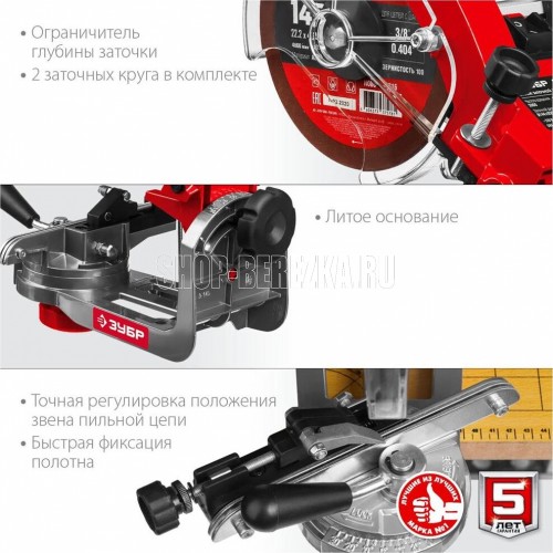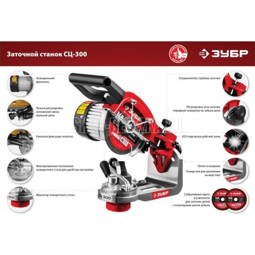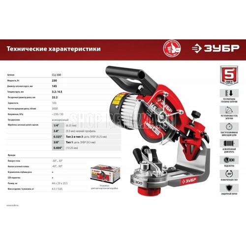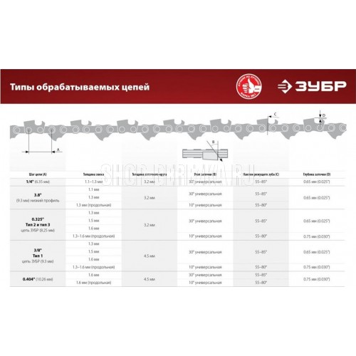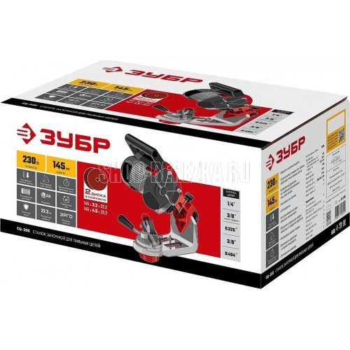 Мощность, Вт 230 Частота вращения, об/мин 3000 Диаметр заточного круга, мм 145 Диаметр посадочного отверстия заточного круга, мм 22.2 Ширина заточных кругов, мм 3.2/4,5 Зернистость заточных кругов 100 Напряжение, В/Гц ~230/50 Тип двигателя Асин хрон ный Поворот стола, Градусы -30…30 Наклон головы, Градусы 40…90 Ограничитель глубины заточки Есть LED подсветка Есть Типы заточных цепей - 1/4? (6.35 мм), - 3.8? (9.3 мм) низ кий про филь, - 0.325? (8.25 мм) Цепь ЗУБР тип 2 и тип 3, - 3/8? (9.3 мм) Цепь зубр тип 1 , - 0.404? (10.26 мм)