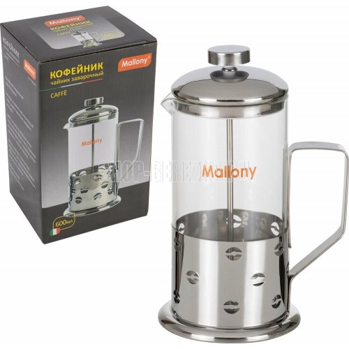 Чайник/кофейник (предназначен для заваривания чая, кофе, прочих напитков). серия — Caffe Объем: 0.6 л Корпус из нержавеющей стали 201, колба из жаропрочного боросиликатного стекла. Фильтр/стержень 304 нерж сталь. Толщина стекла — 2 мм Толщина нерж стали — 0,4 мм Можно мыть в посудомоечной машине только стекл колбу. Коэффициэн линейного расширения стекла — 3.0. Упаковка: цветная картонная коробка.