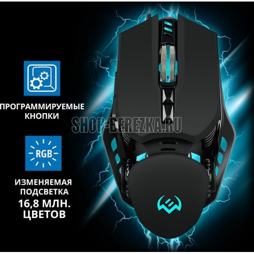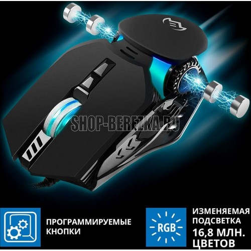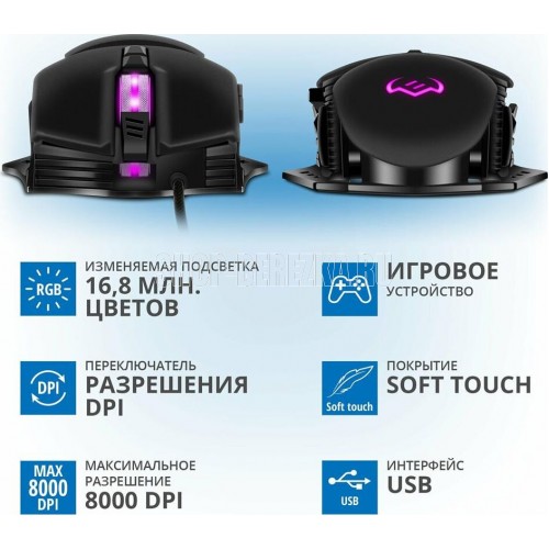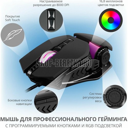 Игровая мышь , проводная, оптическая, количество кнопок - 6, колесо прокрутки, разрешающая способность, DPI 500-8000, интерфейс - USB, кнопки навигации, мягкий бархат софт-тач покрытия, изменяемая подсветка c возможностью управления цветовыми настройками, кабель в тканевой оплетке, длина кабеля - 1,8 м.