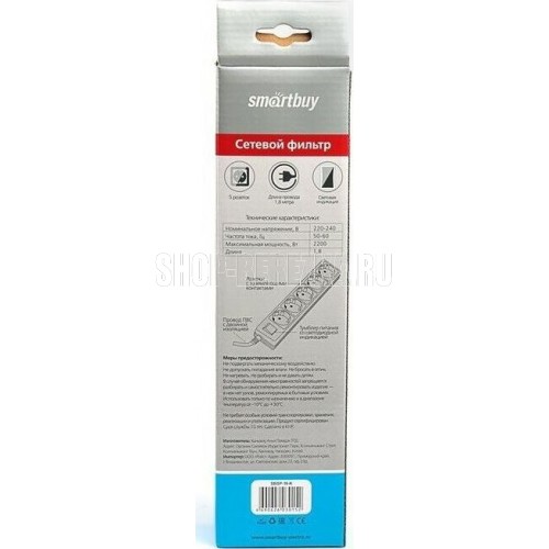 Номинальное напряжение: 220-230 В. Частота: 50-60 Гц. Максимальная мощность: 2200 Вт. Защита от короткого замыкания. Защита от перенапряжения. Защита от превышения токовой нагрузки. Защита от импульсных помех. 5 розеток. Корпус из негорючего пластика.