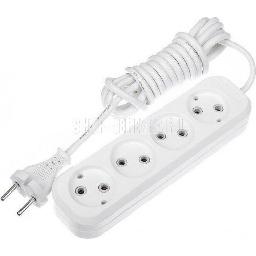 Удлинитель, количество розеток - 4, номинальный ток, А - 10, номинальное напряжение: 250 В; частота: 50 Гц; тип провода: ПВС 2x1,0мм2; материал корпуса: АБС-пластик; климатическое исполнение: УХЛ-3; степень защиты от влаги и пыли: IP-20; длина провода - 3 м.
