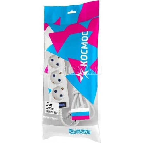 Удлинитель КОСМОС 10А 3 гн ПВС 3*0,75 (5м) 1300Вт с заземл и кнопкой Россия