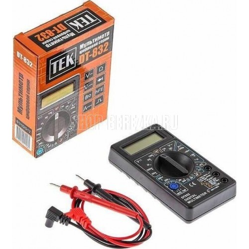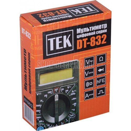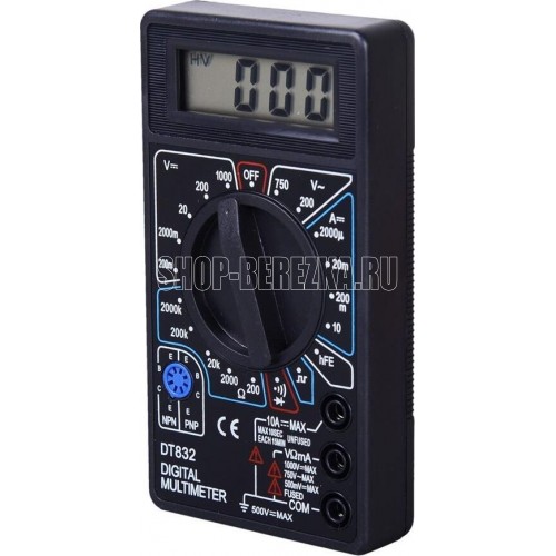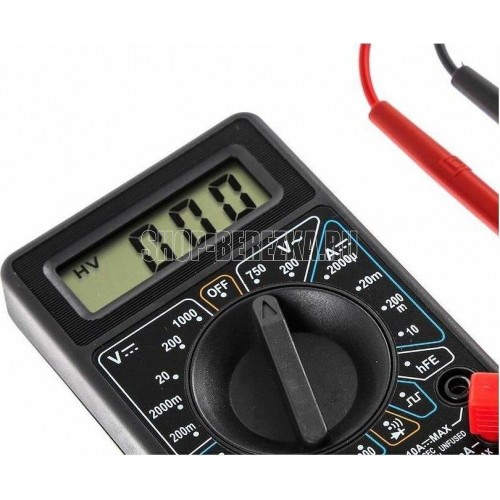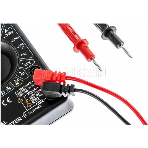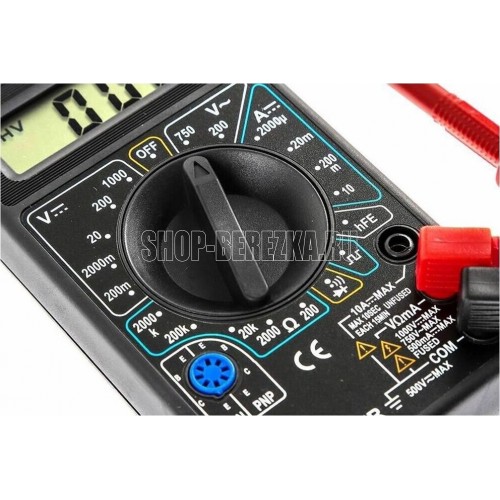Генератор сигнала 5В 50Гц. В этом режиме на выходных щупах прибора, подключенных к гнездам V mA” and “COM” прибора, появляется сигнал 5В (внутреннее сопротивление 50кОм) 50Гц прямоугольной формы. Переключатель режимов работы и пределов. Высокая чувствительность - 100мкВ. Автоматическая индикация перегрузки - "1". Автоматическое определение полярности постоянного тока или напряжения. Все пределы защищены от перегрузок. Измерение сопротивления от 0,1 Ом до 2 МОм. Проверка диодов прямым стабильным током 0.8 мА. Измерение h21E транзисторов при Ib=100 мкА.