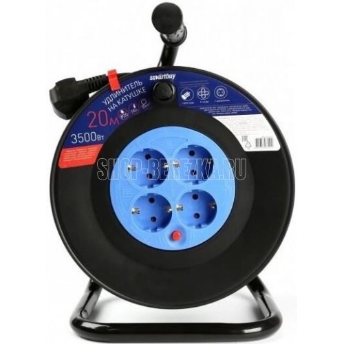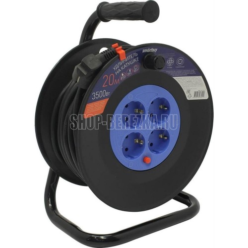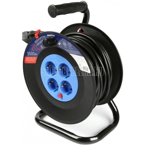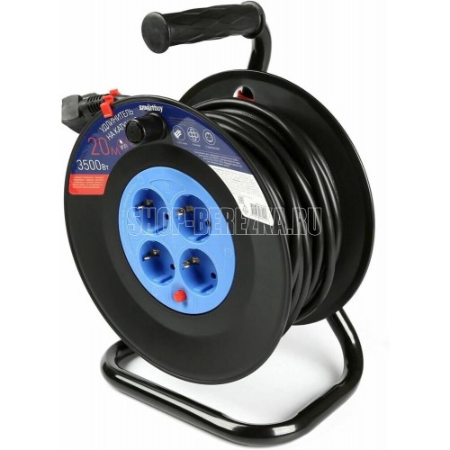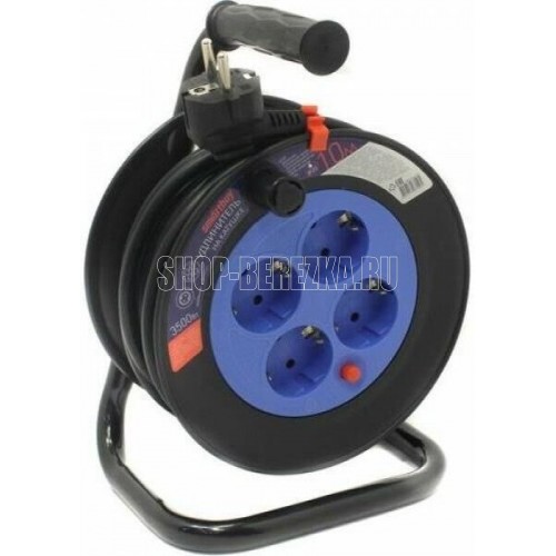 Удлинитель на катушке, количество гнезд - 4 , с заземлением и предохранителем, номинальный ток 16 A, максимальная мощность - 3500 Вт, сечение, мм2 - 2x1,0 мм2, длина кабеля - 20 м.