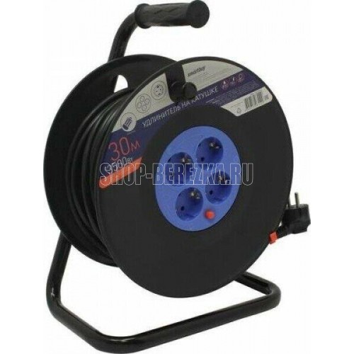 Удлинитель на катушке, количество гнезд - 4 , с заземлением и предохранителем, номинальный ток 16 A, сечение, мм2 - 2x1,0 мм2, длина кабеля - 30 м.