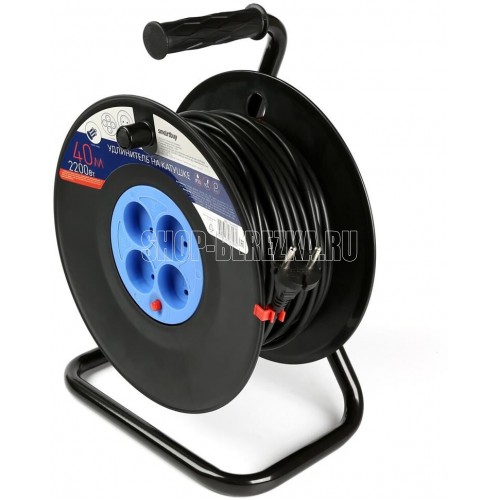 Удлинитель на катушке, количество гнезд - 4 , без заземления, номинальный ток 10 A, сечение, мм2 - 2x1,0 мм2, длина кабеля - 40 м.