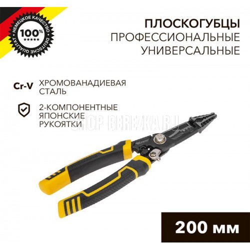 Многофункциональные универсальные плоскогубцы – это инструмент на все случаи жизни, включающий в себя: плоскогубцы, тонкогубцы, бокорезы, инструмент для зачистки кабеля, резак для проводов, напильник, инструмент для обжима клемм. Используются для ремонта автомобилей, мотоциклов, механизмов и т.д. Применяются для монтажных работ, а также в быту. Плоскогубцы изготовлены из профессиональной хромованадиевой стали (60Cr-V), максимальная твердость – 60-62HRC. Оснащены износостойкими двухкомпонентными анатомическими рукоятками, которые не скользят в руках. Тип рукояток – японский. На торцах плоскогубцев расположены насечки, позволяющие использовать инструмент как напильник для тяжелых работ. Плоскогубцы обладают отличной режущей способностью, подходят для резки/зачистки пластика, медных и мягких проводов, а также для обжима изолированных и неизолированных наконечников. Также подходят для зачистки кабеля от 1,27 мм? до 5,30 мм?.