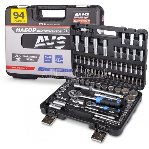 В набор входит 94 предмета. Привод 1/2“ DR • Головка торцевая 6-гранная: 10, 11, 12, 13, 14, 15, 16, 17, 18, 19, 20, 21, 22, 23, 24, 27, 30, 32 мм; • Головка торцевая глубокая 6-гранная: 14, 15, 17, 19 мм; • Головка торцевая свечная: 16, 21 мм; • Рукоятка трещоточная 45 зубцов; • Удлинитель: 125, 250 мм; • Адаптер для воротка 3/8" х 1/2"; • Карданный шарнир; • Держатель бит; • Ключ шестигранный Г-образный: 1.5, 2, 2.5 мм. Биты 5/16"HDR х 30 мм • Бита TORX: Т40, Т45, Т50, Т55; • Бита шестигранная: H8, H10, H12, H14; • Бита шлицевая: SL8, SL10, SL12; • Бита крестовая: PH3, РН4; • Бита POZIDRIV: PZ3, PZ4. Привод 1/4“ DR • Головка торцевая 6-гранная: 4, 4.5, 5, 5.5, 6, 7, 8, 9, 10, 11, 12, 13, 14 мм; • Головка торцевая глубокая 6-гранная: 6, 7, 8, 9, 10, 11, 12, 13 мм; • Рукоятка трещоточная 45 зубцов; • Удлинитель: 50, 100 мм; • Вороток Т-образный 115 мм; • Отверточная рукоятка; • Удлинитель гибкий 150 мм; • Карданный шарнир; • Головка со вставкой TORX