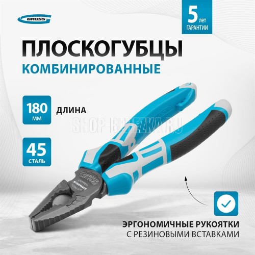 Комбинированные плоскогубцы Gross 16973 длиной 180 мм, с трехкомпонентными рукоятками, используются для перекусывания мягкой и жесткой проволоки, сгибания металлических листов и захвата деталей. Благодаря специальным внутренним граням возможно применение инструмента в качестве гаечного ключа. Плоскогубцы пригодятся профессионалам и частным мастерам для проведения слесарных, строительных и монтажных работ.ПреимуществаЭффективность — благодаря смещенному к режущим кромкам шарниру усилие реза повышено на 20%.Высокий показатель прочности — рабочая часть изготовлена из инструментальной стали 45 методом ковки, а на внешних металлических частях имеются ребра жесткости.Защита от коррозии — покрытие Titan finish продлевает срок службы плоскогубцев.Долговечность — режущие кромки прошли закалку индукционными токами для повышения твердости и износостойкости.Комфортное использование — эргономичные рукоятки с резиновыми вставками удобно лежат в руке, что снижает усталость во время длительной работы.Дополнительные возможности — на нижней части рукояток имеются специальные упоры, на которые можно установить скобу для подвешивания или пружину авторазжима.Подтвержденное качество — производитель предоставляет 5-летнюю гарантию на заводской брак.