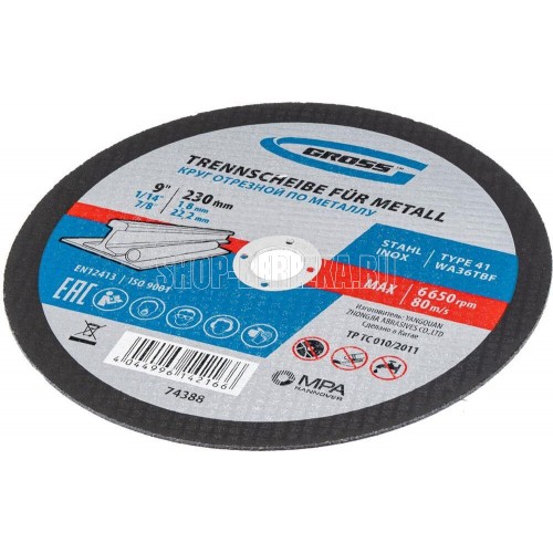 Отрезной круг по металлу Gross WA36TBF 74388, 230 х 1,8 х 22,2 мм, рассчитан на интенсивный сухой рез нержавеющих легированных и углеродистых сталей. Устанавливается на УШМ соответствующего типоразмера. Надежный и производительный, круг подходит для профессиональной эксплуатации с высокими нагрузками.ПреимуществаАбразив из монокорунда с добавками - зерно обладает высокой твердостью и прочностью, подтачивается в процессе работы, поэтому эффективность реза не снижается.Очень высокий ресурс - в бакелитовую связку и абразив включены специальные добавки.Безопасность работы - высококачественная двухслойная стеклосетка защищает круг от перегрузок, предотвращая его разлет в случае зажатия в материале.Специальный состав - круг слабо нагревается в процессе реза, износ происходит медленно и равномерно, поэтому образуется минимальное количество пыли и искр.Толщина 1,8 мм и крупный абразив F36 - круг обладает высокой износостойкостью и обеспечивает стабильность реза при больших объемах работ.Плотная равномерная структура - круг прошел дополнительное тестирование на дисбаланс, это обеспечивает стабильность и точность работы.Проверенное качество - круг прошел контроль на всех этапах производства, что подтверждено ганноверским и российским сертификатами безопасности.
