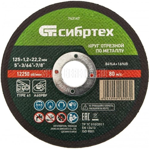 СИБРТЕХ Круг отрезной по металлу, 125 х 1,2 х 22,2 мм 743147