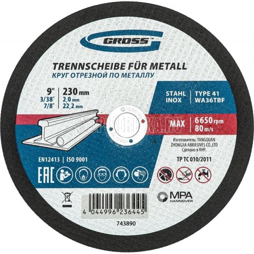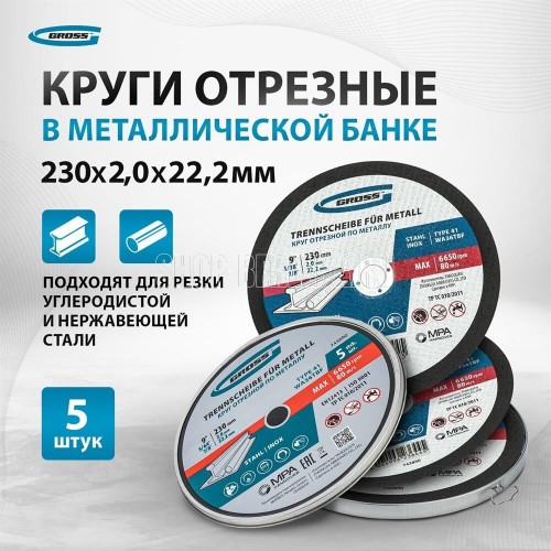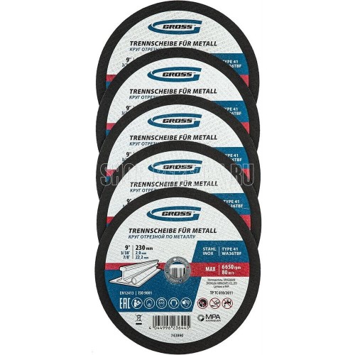 GROSS Круг отрезной по металлу, 230 х 2,0 х 22,2 мм, WA36TBF, в метал.банке, 5 шт. 743890