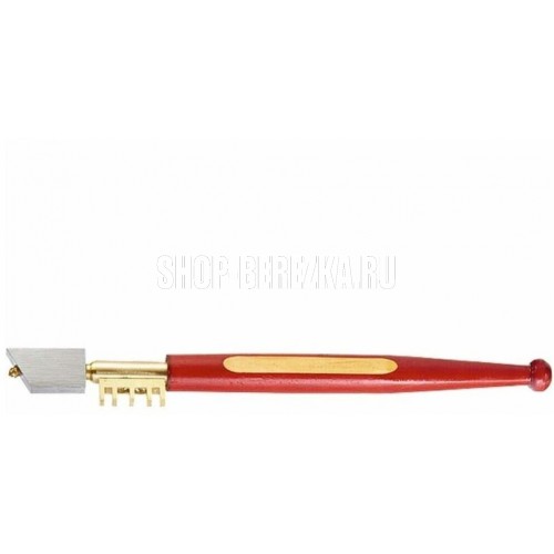 Рукоятка изготовлена из древесины и покрыта лаком. Режущим элементом является искусственный алмаз. Головка инструмента имеет специальную форму для удобства в работе. Стеклорез имеет четыре паза размерами 2, 3, 2 x 4 мм, предназначенных для захвата при ломке узких кромок стекла.