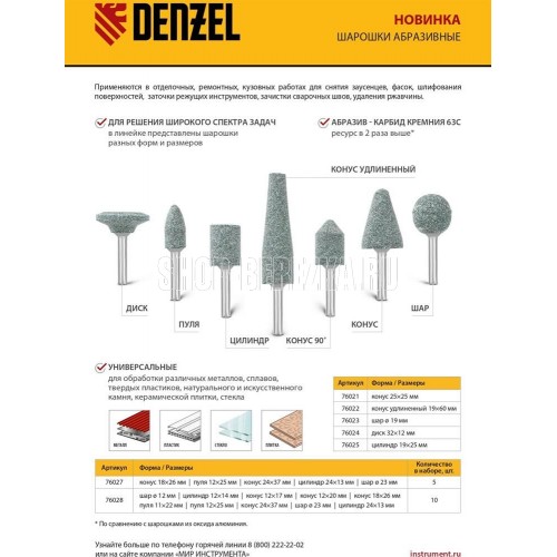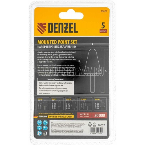 Набор Denzel 76027 включает в себя 5 шарошек для дрели, шуруповерта или прямошлифовальной машины (ПШМ). Оснастка предназначена для зачистки сварных швов, канавок, углублений, снятия фасок и заусенцев, расширения отверстий и обработки деталей с рельефной поверхностью. Набор шарошек пригодится в ремонтной мастерской, автосервисе, будет полезен при выполнении отделочных работ.ПреимуществаИзносостойкость — карбид кремния (63C) сохраняет рабочие свойства вдвое дольше, чем оксид алюминия.Универсальность — шарошки подходят для обработки металла, различных сплавов, стекла, пластика, керамической плитки, натурального и искусственного камня.Решение широкого спектра задач — в набор входят шарошки наиболее популярных размеров и форм (конус, пуля, цилиндр, шар).