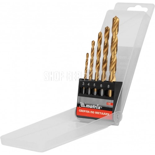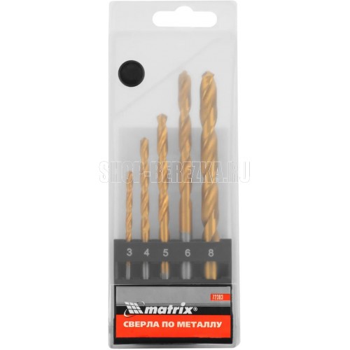 Набор Matrix 72383 включает 5 нитридтитановых сверл из стали HSS, с цилиндрическим хвостовиком, упакованных в пластиковую коробку, которые используются для получения в металле отверстий диаметром 3-4-5-6-8 мм.