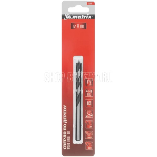 Сверло по дереву Matrix 70206 размером 8 х 117 мм, с цилиндрическим хвостовиком, предназначено для получения отверстий в древесине. Особая конструкция обеспечивает эффективный отвод стружки и получение точного и ровного отверстия.