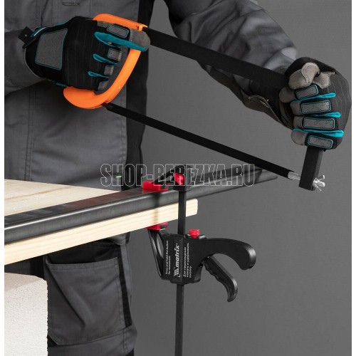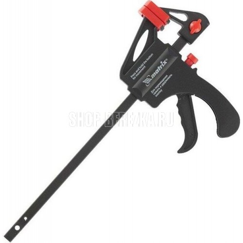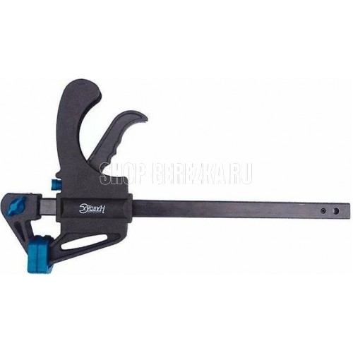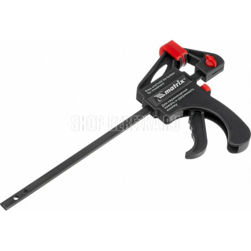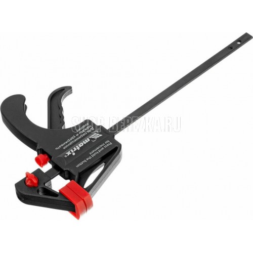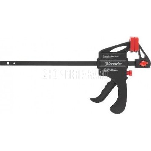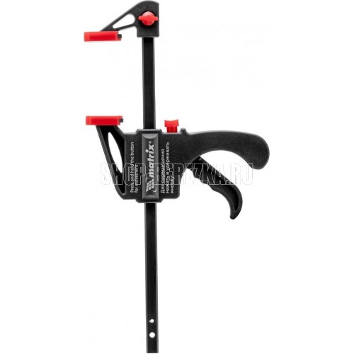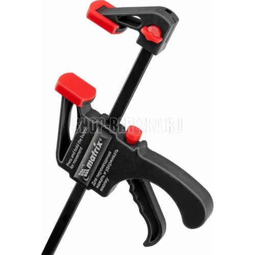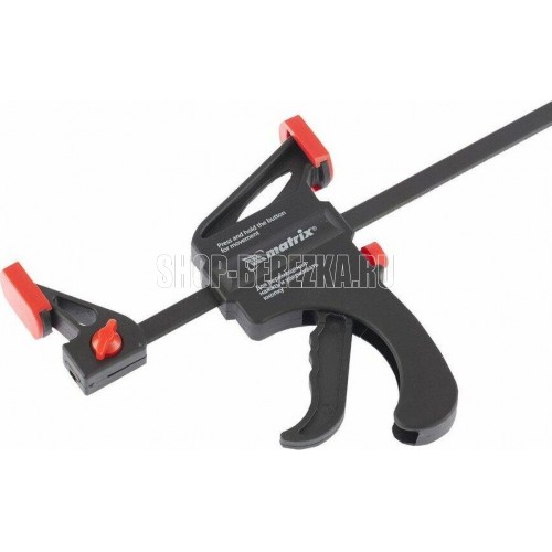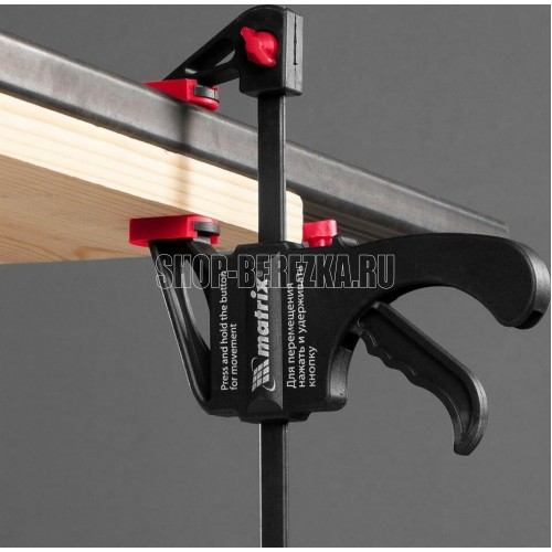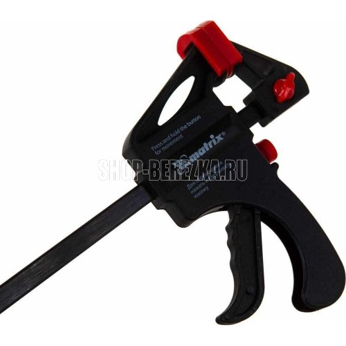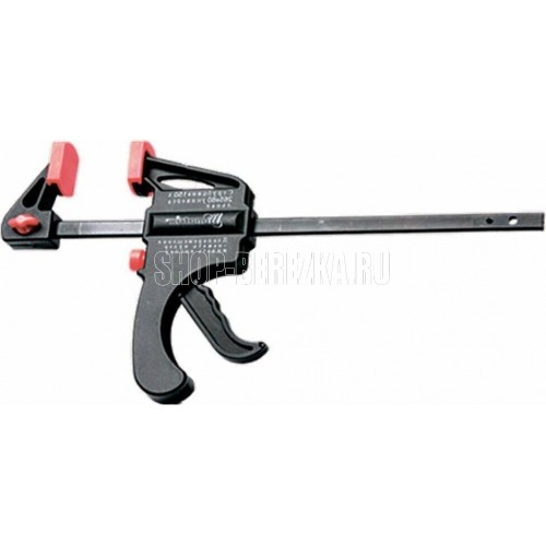Струбцина изготовлена из ударопрочной пластмассы. Направляющая стальная. Рабочие губки снабжены накладками для предотвращения повреждений обрабатываемых предметов. Опорная губка перемещается и фиксируется по всей длине направляющей при помощи ручки, а также может переставляться на другой конец направляющей, что позволяет использовать струбцину на разжим.