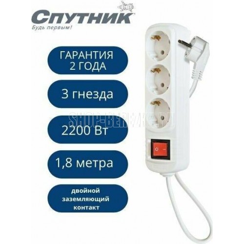 3 - розетки без заземления, длина шнура 1, 8 м, трехжильный кабель ПВС, номинальное напряжение 220 В, рабочая частота 50-60 Гц, максимальный ток 6А, степень защиты IP20.