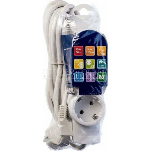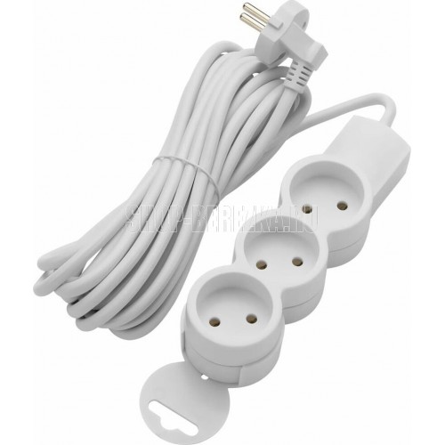 Удлинитель бытовой, без заземления, количество гнезд - 3, подключаемая мощность : 2200 Вт, степень защиты: IP20, тип провода и сечение: 2Gх0,75, цвет: белый, длина: 5,0 м.