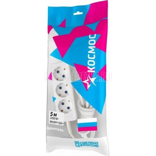 Удлинитель КОСМОС 10А 3 гн ПВС 3*0,75 (3м) 1300Вт с заземл и кнопкой Россия