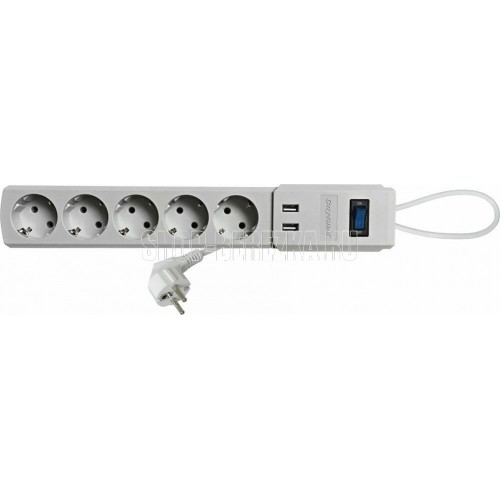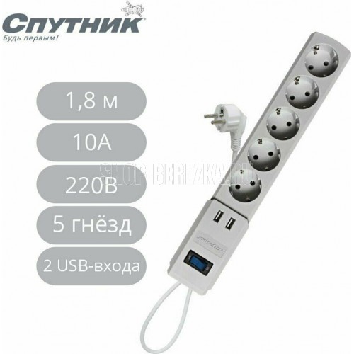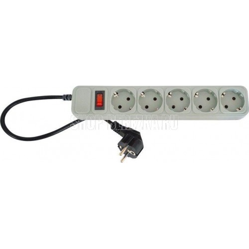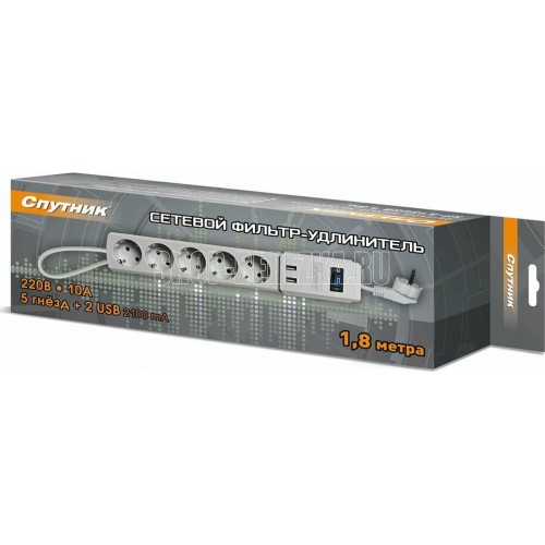 Трёхжильный кабель ПВС, сечение 0,75 мм2, заземление, номинальное напряжение: 220 В, рабочая частота: 50-60 Гц, сила тока: 10 А, макс. мощность нагрузки: 2200 W (2,2 кВт), 5 гнезд, длина кабеля: 1,8 м, материал: пластик ABS, индивидуальная цветная коробка