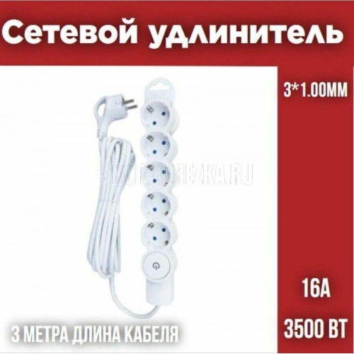 Номинальное напряжение, частота: 230В, 50Гц / максимальный ток нагрузки: 16А / максимально допустимая суммарная мощность нагрузки: 3500Вт (3,5 кВт) / тип провода (кабеля): ПВС / сечение кабеля: 3х1,00 мм? / длина провода: 3 м / количество штепсельных гнёзд: 5 / защитные шторки: да / заземляющий контакт: да / материал деталей контактных групп: латунь / материал колодки: пластик PP / степень защиты IP20 / кнопка питания со светодиодной подсветкой / крепление «Quick Fix» /