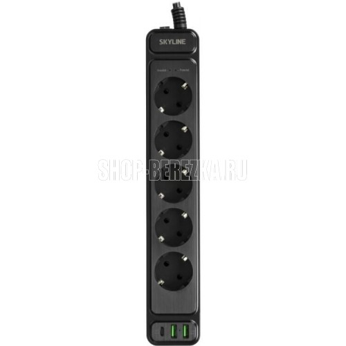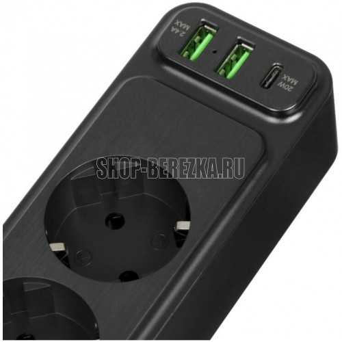 Сетевой фильтр с 2xUSB+1xType-C портами; Розетки 5 шт.; Длина кабеля 2 метра; Цвет черный; Максимальная мощность 4000W (16A); 2xUSB, 1xType-C (Максимальная суммарная сила тока: 3 А), поддержка QC/PD; Защитные шторки, Защита от перегрузки и короткого замыкания, Индикатор работы, Индикатор заземления; Стильный лаконичный дизайн; Огнеупорный пластик; Питание AC 220-250V 50Hz.