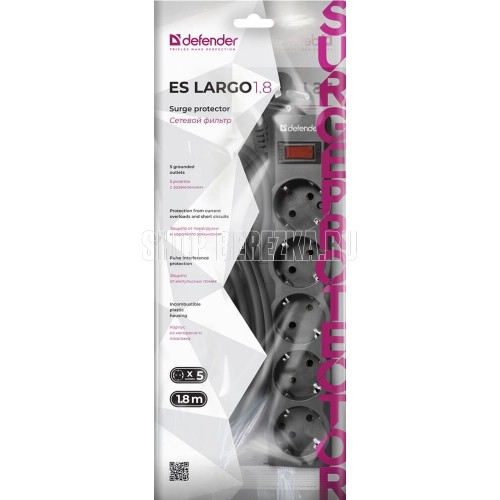 Сетевой фильтр, 5 розеток, номинальное напряжение: 220 В/ 50-60 Гц, мощность нагрузки 2200 Вт, максимальный ток нагрузки 10А, защита от перегрузок и короткого замыкания - автоматический несгораемый предохранитель, длина шнура 1,8 м.