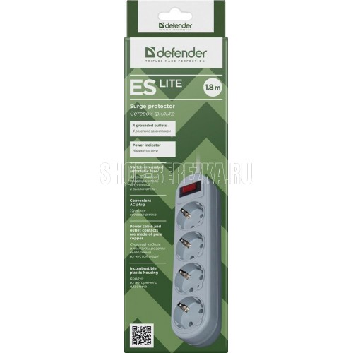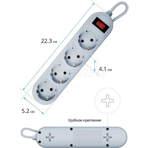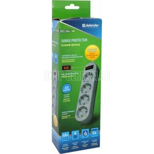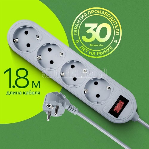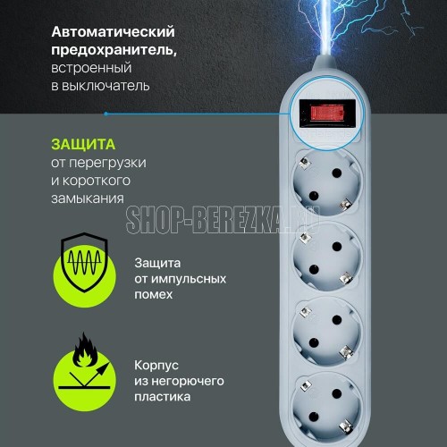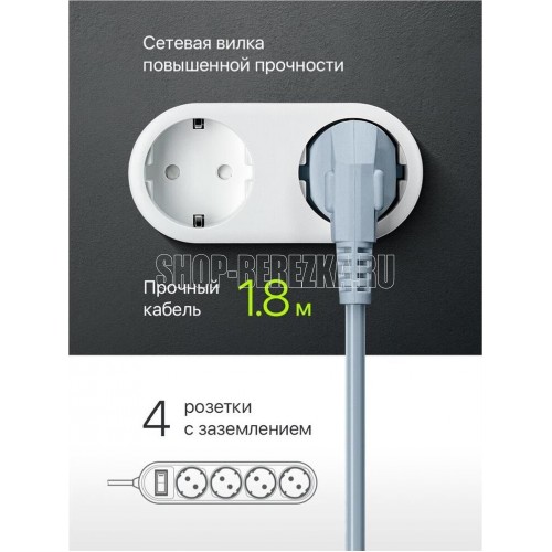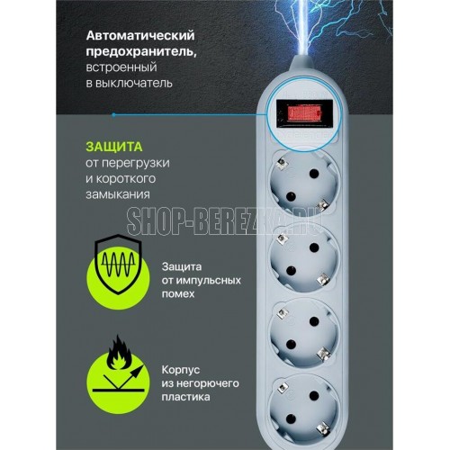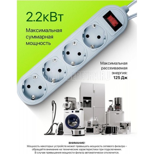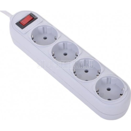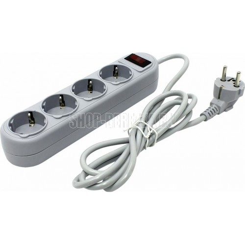 Сетевой фильтр, количество розеток - 4 шт., длина кабеля - 1,8, номинальное напряжение/частота - 230 В / 50 Гц, максимальная суммарная мощность нагрузки - 2200 Вт, максимальный ток нагрузки - 10 А, материал корпуса - негорючий пластик, форма упаковки - картонная коробка.