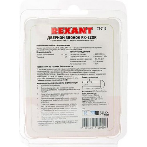 REXANT (73-0110) Звонок электрический 220 вольт с регулятором громкости