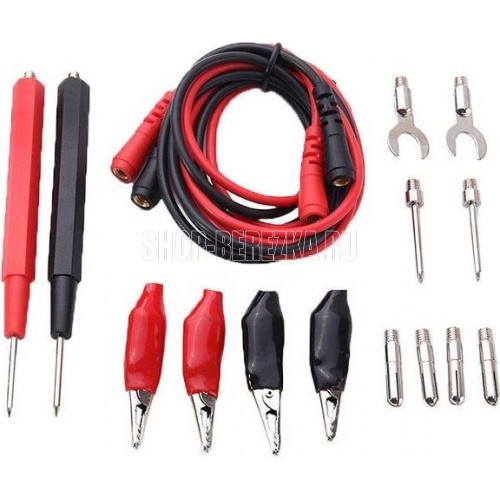 В комплекте: Провод для щупов: красный 1 шт., черный 1 шт. Щупы: 2 шт. Иглы: 2 шт. «вилки»: 2 шт. «банан»: 4 шт., «крокодил»: 4 шт. Длина провода 900 мм Напряжение: до 600 В Постоянный ток: до 10 А Набор со сменными окончаниями. Позволяет самостоятельно собирать два измерительных шнура с необходимыми окончаниями. · Два шнура (красный/черный) длиной ~92 см с резьбовыми адаптерами (внутренняя резьба) · Два изолированных щупа (красный/черный) длиной ~110 мм (внешняя резьба) · Четыре изолированных зажима тип «Aligator» (красный/черный) длиной ~40 мм (внешняя резьба) · Два щупа длиной ~20 мм (внешняя резьба) · Две клеммы тип «U» 6.4 мм (внешняя резьба) · Четыре цанговых клеммы тип «Banana» (внешняя резьба).