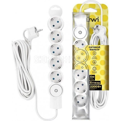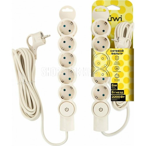 Сетевой фильтр 5 гнезд, с выключателем, с заземлением, 10А/2,2кВт, 5м, слоновая кость
