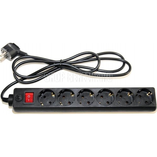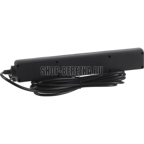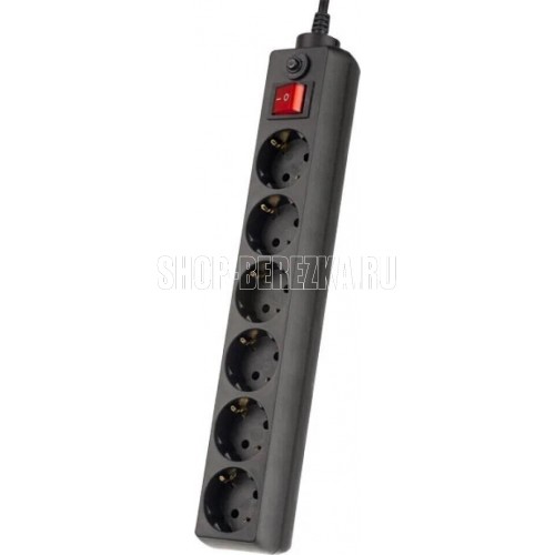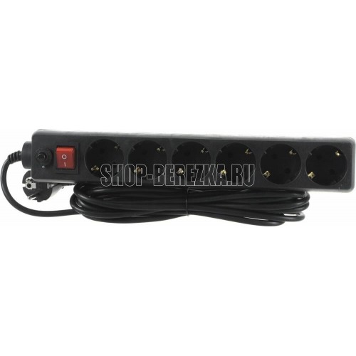 Cетевой фильтр, количество розеток - 6 (евростандарт с заземлением), номинальный ток нагрузки - 10А, номинальное входное напряжение - 220В, корпус из ударопрочного негорючего материала, длина кабеля - 5,0 м.