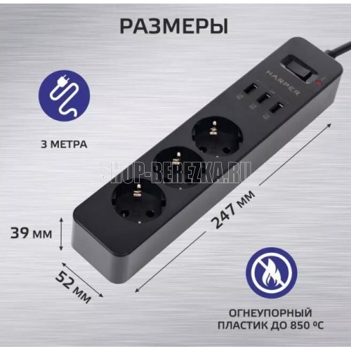 Тип оборудования: Сетевой фильтр. Длина кабеля : 1.5 м. Источник питания: AC 220-240 В 50 Гц. Максимальная мощность нагрузки: 3680 Вт. Максимальный ток нагрузки: 16 А. Количество розеток: 3. Количество USB портов: 3. Максимальная сила тока на 1 USB порт: 3.4 А. Защитные шторки: да. Заземление: да. Материал корпуса: Огнеупорный пластик. Комплектация: Сетевой фильтр, инструкция по эксплуатации. Цвет: белый. Размеры (ШхВхГ): 247х39х52 мм. Вес: 380 гр.
