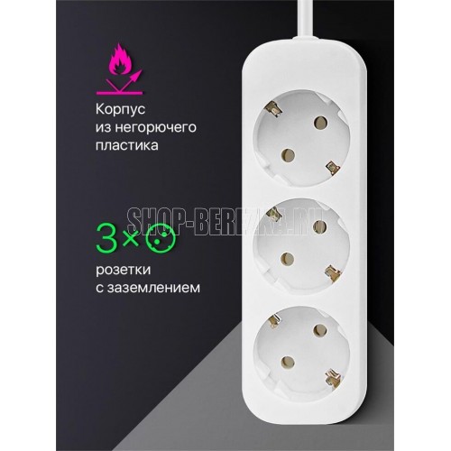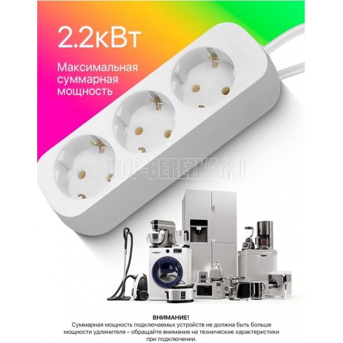 Материал корпуса Негорючий пластик, Количество розеток 3 шт. Номинальное напряжение/частота 230 В / 50 Гц, Максимальная суммарная мощность нагрузки 2200 Вт, Максимальный ток нагрузки 10 А, Длина 1.8 м