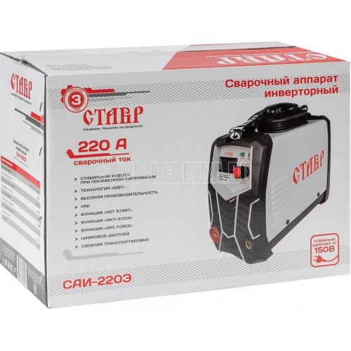 Тип сварки: ММА (ручная дуговая электродная). Напряжение сети / Частота: 220 В (+10; -30 %) / 50 Гц. Максимальная потребляемая мощность: 4,6 кВт. Максимальный потребляемый ток: 21 А. Род сварочного тока: постоянный. Диапазон сварочного тока: 20-220 А. Цикл работы: 180 А / 100 %; 220 A / 80 %. Напряжение холостого хода: 24,8 В. Диаметр электродов: 1,6 - 5 мм. Работа от генератора: 7 кВт. Класс изоляции: H. Класс защиты: IP 21. Работа от пониженного напряжения: от 150 В. Длина сетевого кабеля: 3 м.